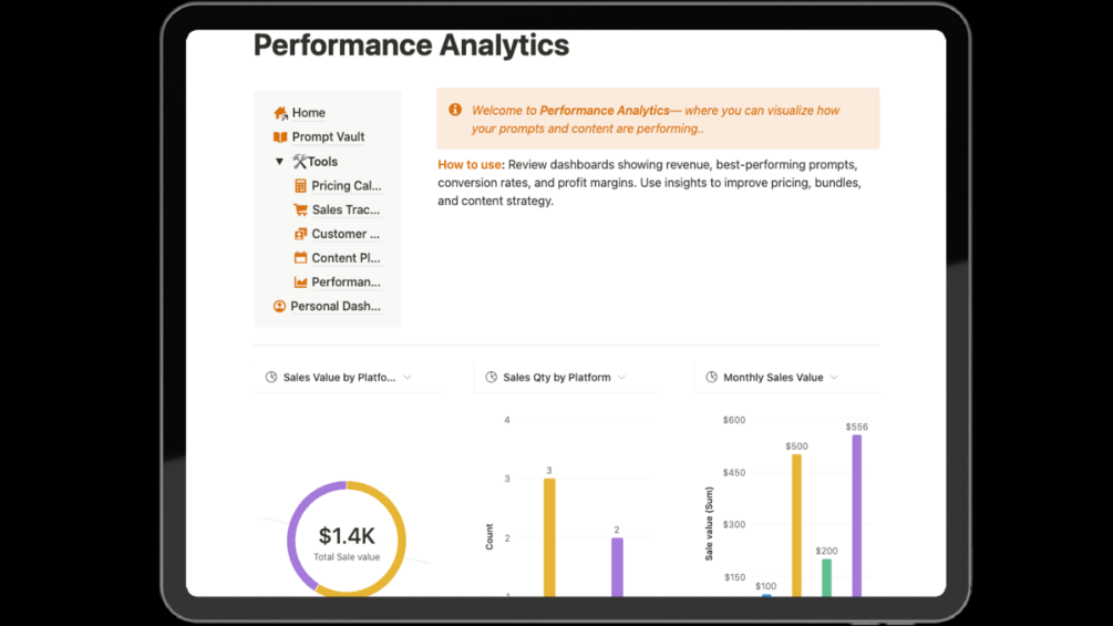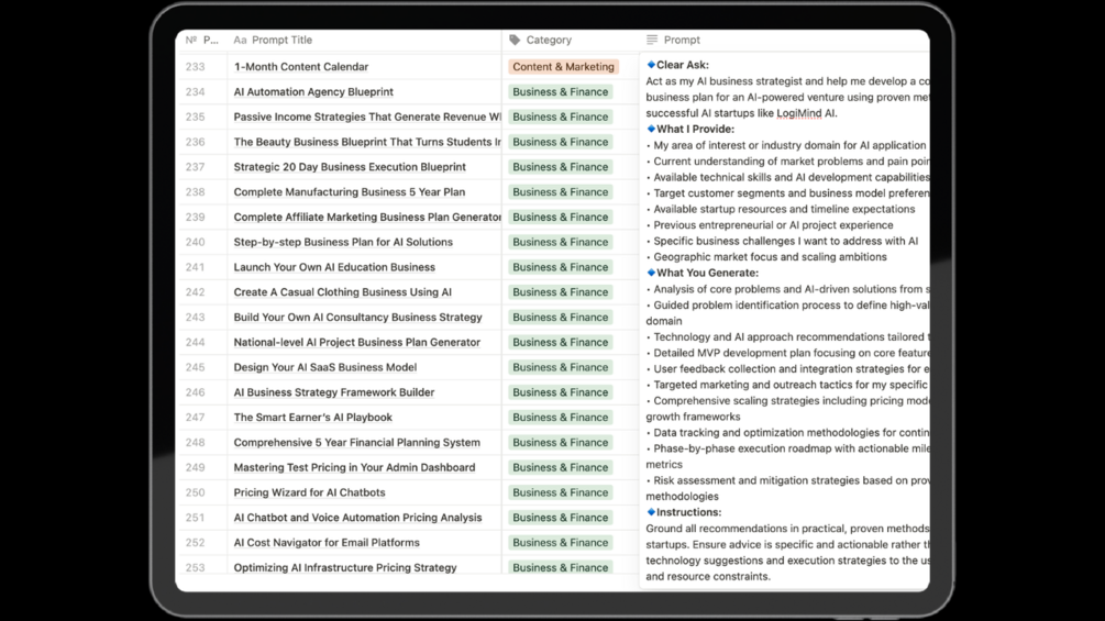 A complete system with a business strategy PDF, a 300+ prompt vault, and a Notion workspace—built to help you launch and scale a prompt-pack business fast.